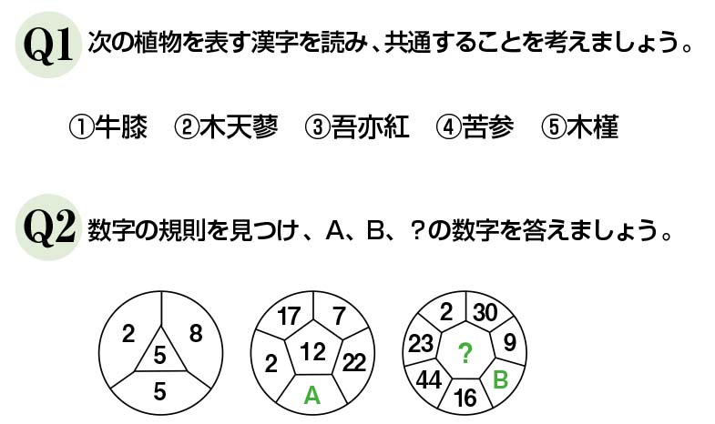 Q1:①いのこずち ②またたび ③われもこう ④くらら ⑤むくげ。共通するのは、すべて秋の季語に使われるということ。